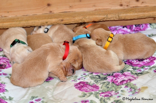 Štěňátkům je už týden a mají se čile k světu. Mají za sebou první stříhání drápků. Barvičky kožíšků budou od zlaté až po sytě zlatou barvu. Volný už pouze jeden klučík.
